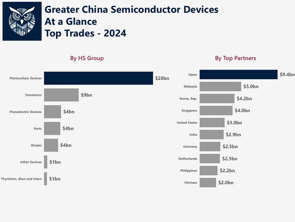 The semiconductor device trade in Greater China has shown steady expansion from 2016 to 2024, with a notable peak in 2021 followed by a pullback in 2023 and 2024. Regional integration is evident through diversified trade corridors, especially with Japan, India, and Southeast Asia. Photovoltaic Devices dominate the product landscape, followed by Transistors and Diodes, with trade flows concentrated in China’s exports to Japan and imports from Malaysia. Pricing trends remained relatively stable, but trade balances shifted, with India and Brazil emerging as surplus partners while deficits widened with Malaysia and Japan. Strategically, the region faces both opportunity in emerging markets like Brazil and risk from declining corridors such as China–Japan, suggesting a need for policy recalibration and diversification.